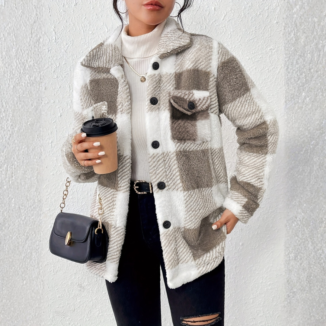 On l’enfile et tout s’apaise : intérieur moelleux, carreaux élégants et une coupe droite qui glisse sur un pull sans alourdir.