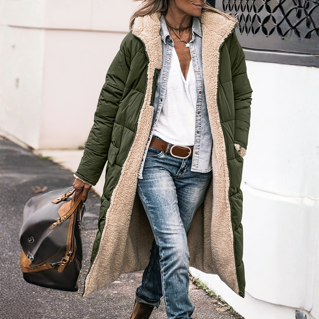 La longueur mi-cuisse allonge naturellement, la capuche rassure lors des petites brises, et la fermeture zippée garde une allure propre et soignée.
